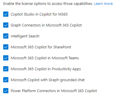 Basically, if you want a user to be able to make a customised Copilot in Copilot Studio and publish it to be used from M365 apps, turn on this option of the license.